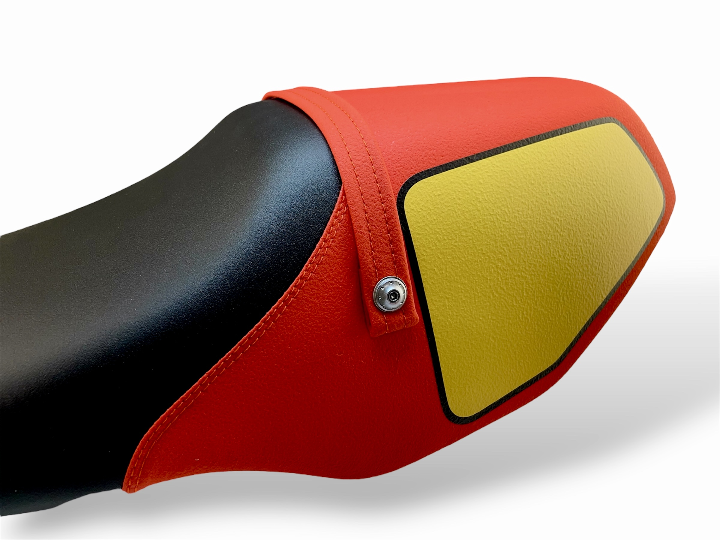イタリアンハンドメイドのシートカバーは、加速時やブレーキング時のライダーのホールド性を高め、あらゆるライディングコンディションでの自由度と安全性を提供します。ハンマートーンの槌目仕上げを施したテクニカルレザー(人工皮革)を使用しグッツイにさらなる上質さを与えます。